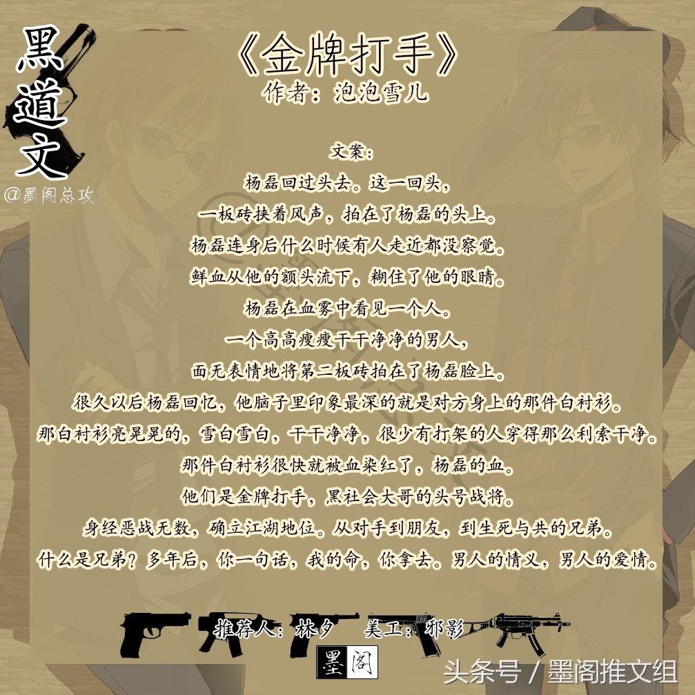 文案:杨磊回过头去。这一回头,一板砖挟着风声,拍在了杨磊的头上。杨磊连身后什么时候有人走近都没察觉。鲜血从他的额头流下,糊住了他的眼睛。杨磊在血雾中看见一个人。一个高高瘦瘦干干净净的男人,面无表情地将第二板砖拍在了杨磊脸上。很久以后杨磊回忆,他脑子里印象最深的就是对方身上的那件白衬衫。那白衬衫亮晃晃的,雪白雪白,干干净净,很少有打架的人穿得那么利索干净。那件白衬衫很快就被血染红了,杨磊的血。他们是金牌打手,黑社会大哥的头号战将。身经恶战无数,确立江湖地位。从对手到朋友,到生死与共的兄弟。什么是兄弟?多年后,你一句话,我的命,你拿去。男人的情义,男人的爱情。