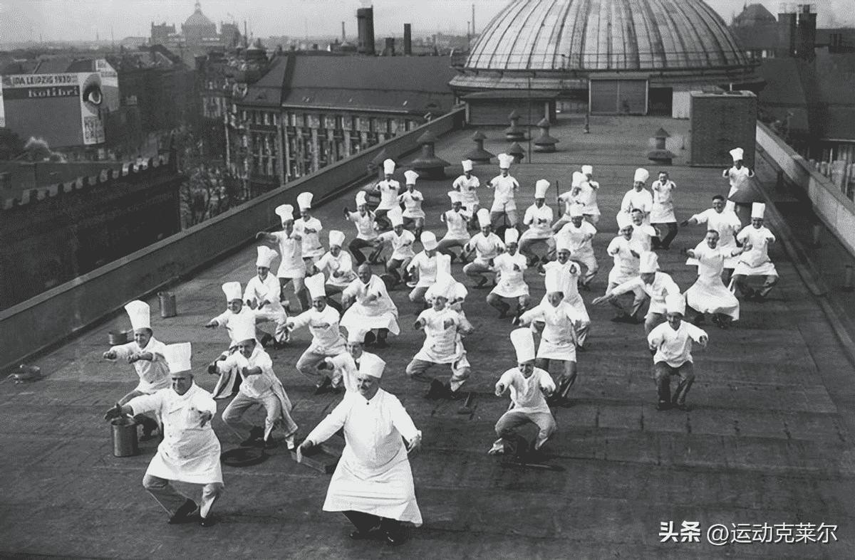 大约在1930年的德国,一群厨师们在屋顶上锻炼,看着像是在蹲马步。