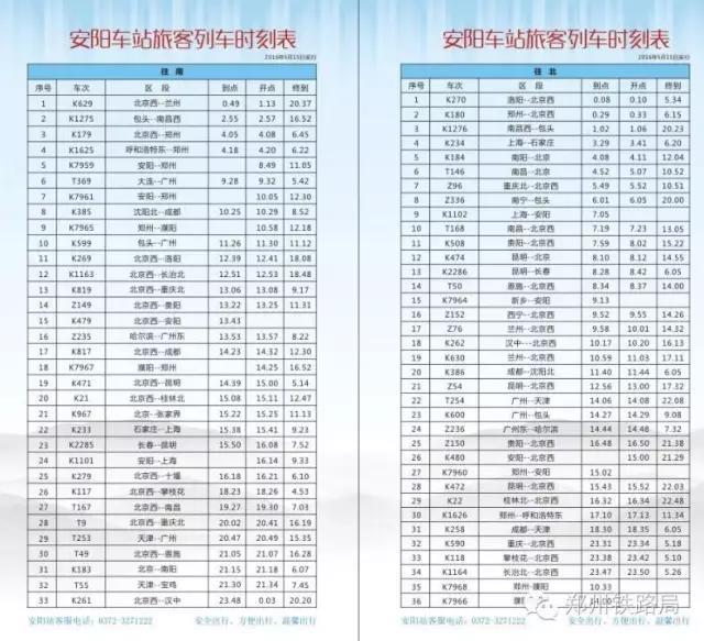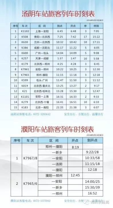 各位小伙伴:5月15日铁路部门调图后,安阳车务段管内各客运站均涉及车次调整或增加,届时,安阳、濮阳人民去北京、上海、广州等一线城市将更加方便。