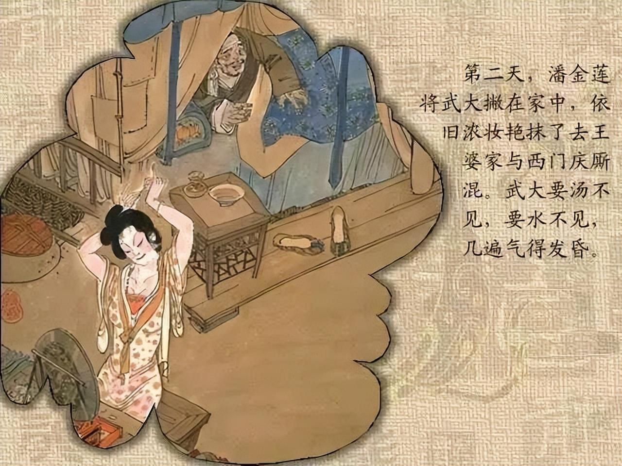 潘金莲为了永久的和西门庆在一起,第一次展示了这个女人狠毒心肠,光天化日,朗朗乾坤,竟为了个人的私欲结束了自己丈夫的性命,一点感情都没有。