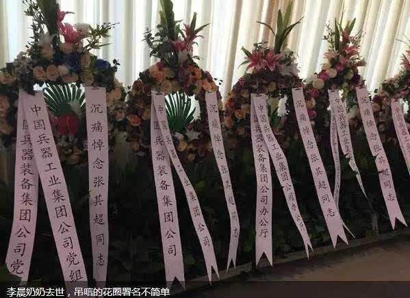 图片中张其超老人就是李晨的奶奶,是一名老革命。在送来的花圈上标有中国兵器工业集团公司 字样。可见李晨奶奶的背景很不一般。