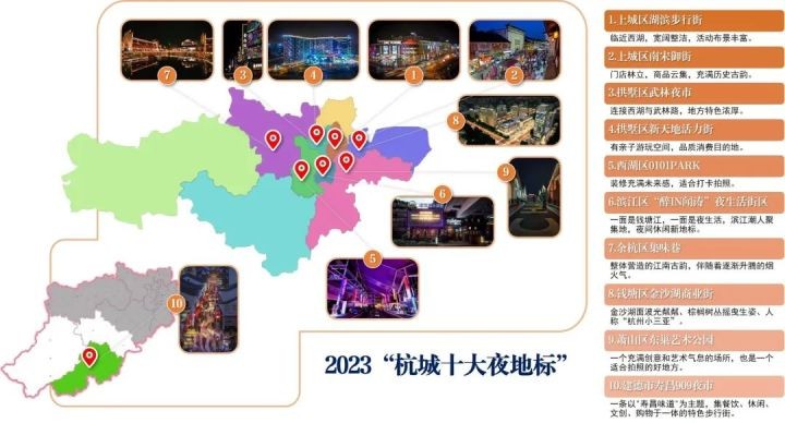 今年6月,杭州发布了《关于打造“不夜天堂 乐购杭州”的实施方案》,明确大力发展夜间经济。在打造“不夜天堂•乐购杭州”的目标指引下,2023“杭城十大夜地标”被点亮,它们分别是上城区湖滨步行街、上城区南宋御街、拱墅区武林夜市、拱墅区新天地活力街、西湖区0101PARK、滨江区“醉IN闻涛”夜生活街区、余杭区集味巷、钱塘区金沙湖商业街、萧山区东巢艺术公园、建德市寿昌909夜市。