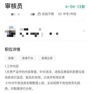 互联网大厂的门槛相对较低一点。但在招聘牌要求上,往往都会着重提到心理承受力要强这一点。而开头提到的首席淫秽色情鉴定官,难度就更大了。