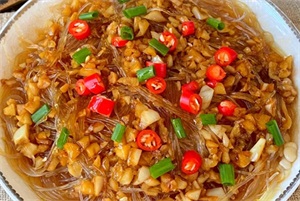 (5)盘中底部铺一层金针菇,上面铺一层粉丝,再淋入刚才煮好的料汁,放入锅中蒸至食材熟透,关火,端出来就可以开吃了!