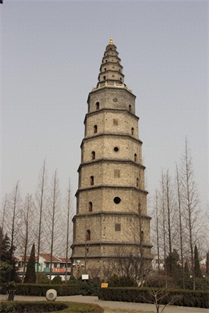 因而,后来宝塔西南方向的兖州西南城里,就遗留下了蛤蟆坑、眼镜坑、青莲坑、 哑巴坑等二九一十八个大坑塘。在宝塔建造到十丈多高时,那塔身周围拥垫的黄土漫道,已往四下延伸了两里路之多。当浮图修造到第七 层时,大匠赵守忠即问释法性:“想问禅师,这镇妖的宝塔现已造到一十三丈之高,也该封顶了吧?”站在七层之高漫道上的释法性,朝下看了看略略沉思片刻说 道:“阿弥陀佛,众工匠和社人现已劳顿了年余,造塔的物料也用了许多,按说是该封顶,可这鳌鱼精已修炼了五百年,妖术不浅,倘若镇压不住,那可是后患无穷 啊!为使瑕丘大地之上的芸芸众生免遭秧祸,要再造一六层小塔,压镇在这七层塔身之上,方能普渡众生!”从而就形成了型制颇为奇特的楼阁式砖塔,宝塔呈平面 八角形、高十三层计五十四米、全塔无累赘、层层叠射出短檐。塔中设有踏步,可沿梯级巡回攀登而至七层平台,扶栏远眺苍茫天地。(朱当沔):“峥嵘塔与白云 齐,影落灵光古殿低”。当隋仁寿二年(602年)九月九,镇妖宝塔落成之时,释法性就用白金,打制了一个五尺单七寸的宝葫芦,置于宝塔十三级之顶,并在宝 葫芦上镌刻了六字真言的镇妖咒语,同时又在金葫芦上设置了金风嘴,天风一起,那金风嘴便会发出像僧人念诵经文的悦耳之声,能传扬十数里之远。释法性还在塔 顶安置了夜明珠、避火珠、避水珠、避尘珠等一百零八颗宝珠,昼夜塔顶金光灿灿。 在宝塔兴造好之后,释法性又化缘兴修了占地三百亩的普乐寺,进行传经布道,拜佛求禅。