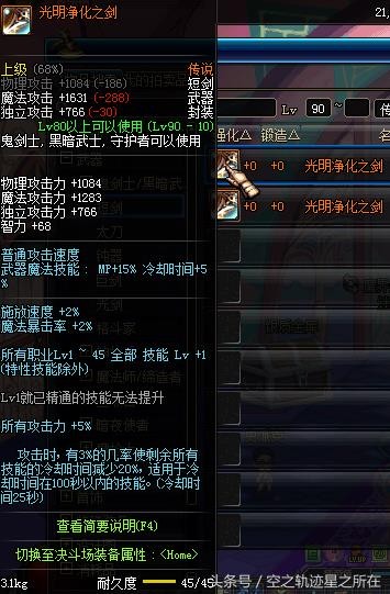 作为90的新增传说武器,基础不低,所有技能攻击力加百分之5,虽然比较鸡肋但是还是可以啃的。特殊效果是减CD,攻击时百分之3几率触发。如果选择光明净化之剑的话小编还是不怎么推荐的,价格稍微比杰诺的灵魂之剑贵500w左右,但是他的特殊效果减CD触发的实在是感人,经过实测,几乎不怎么触发。所以不怎么值得入手。