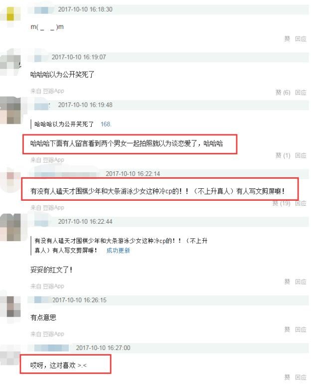 发现围棋少年和游泳少女只是友情线下聚会后,网友们纷纷调侃,说还蛮喜欢这对~