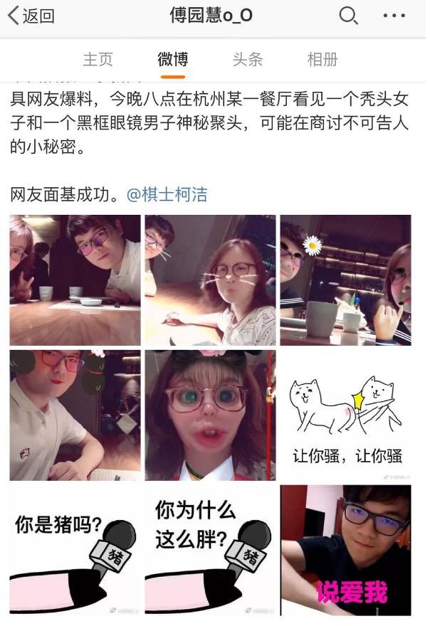 10月9日晚上,傅园慧发了一条微博:“网友面基成功”。一组与围棋天才少年柯洁的合影,让网友们高呼被吓了一跳,以为游泳少女高调公开恋情了。