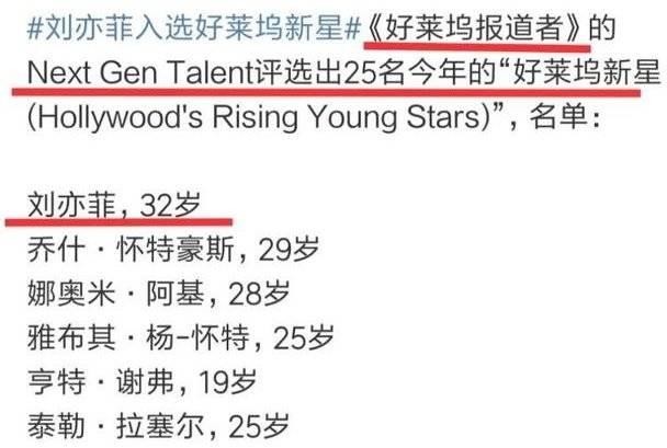 近日,杂志《好莱坞报道者》的NextGenTalent评选出25名今年“好莱坞新星(Hollywood'sRisingYoungStars)。入选者分别是:刘亦菲,乔什·怀特豪斯,娜奥米·阿基,雅布其·杨-怀特等人。