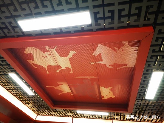 仰头,天花板上除了另外一种古典的回纹,中间装饰以有镂空洞的网状板,黄色的纹路构成驷马的马车图案。