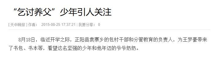 天中晚报,2015-08-25,“乞讨养父”少年引人关注