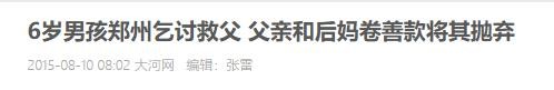大河网,2015-08-10,6岁男孩郑州乞讨救父 父亲和后妈卷善款将其抛弃