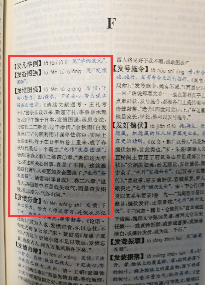 于是我又拿出了商务印书馆《现代汉语词典》(第七版),在这个组词里,仅仅有“发愤图强”,“发奋图强”竟然没有了踪迹。