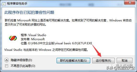3.在弹出的“程序兼容性助手”对话框中点击“运行程序”(若有“恶意软件保护”程序请点击运行)