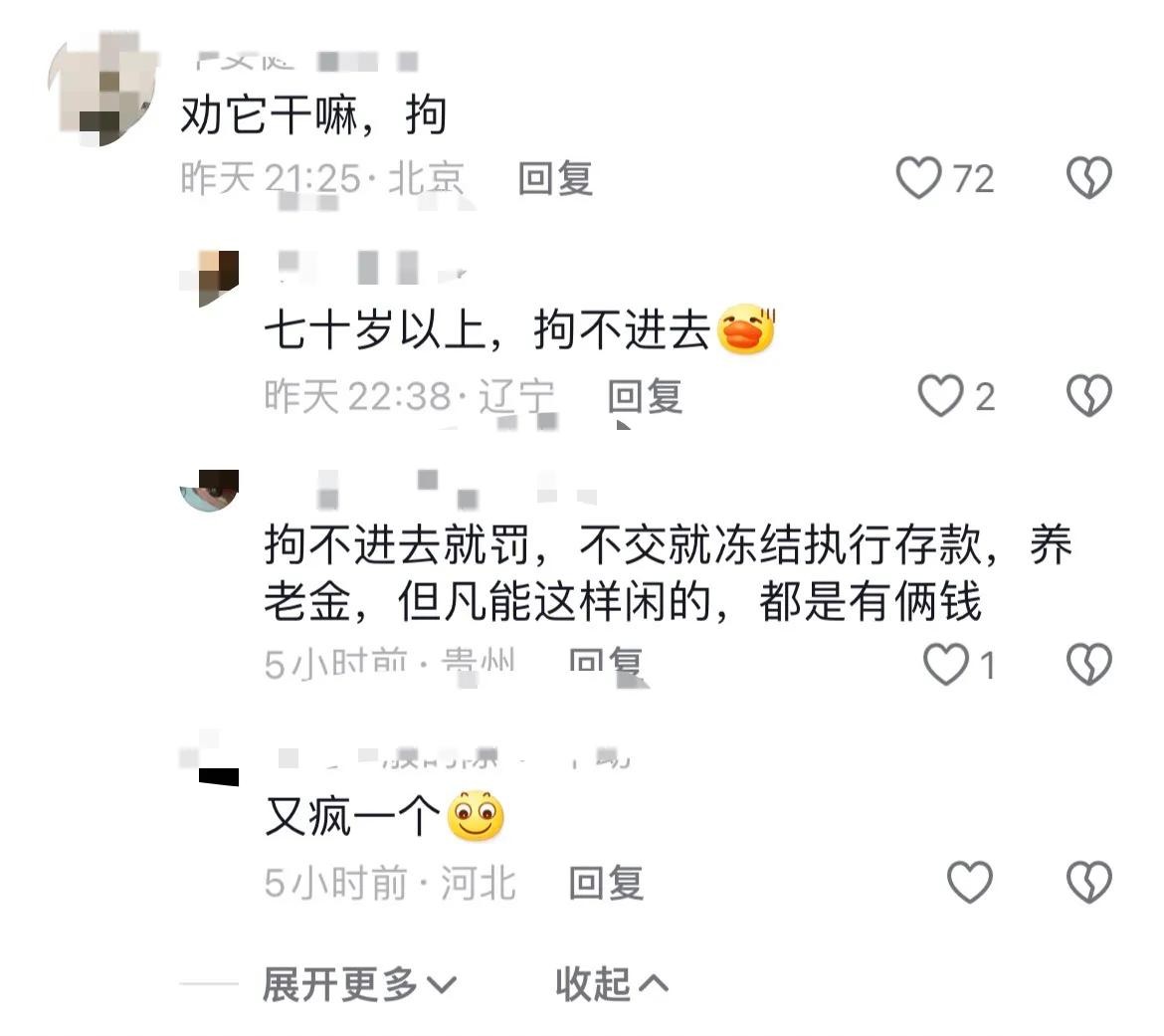 网友C说:拘不进去就罚,不交就冻结存款,养老金,但凡能这样闲的,都是有俩钱
