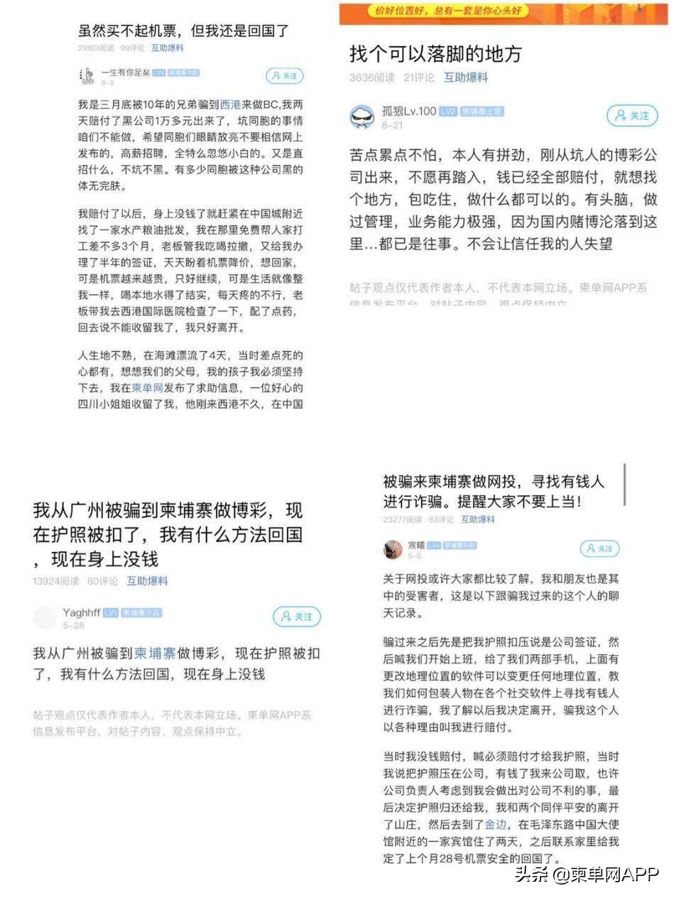 其实,此类高薪骗局不止在新闻里重复上演,往往也发生在我们身边。柬单网上也经常有同胞发布求助信息,并分享自己被骗过来从事网投工作的经历。