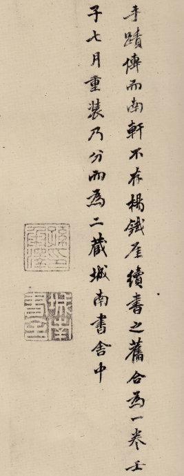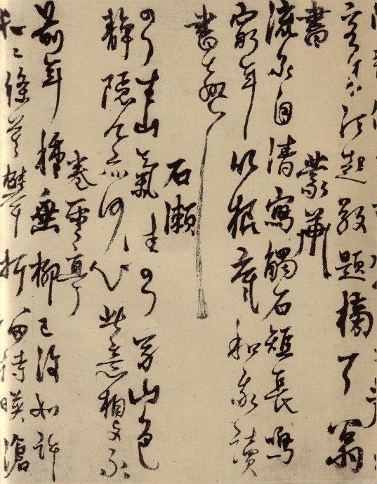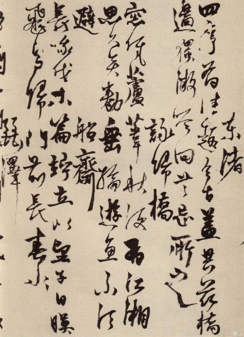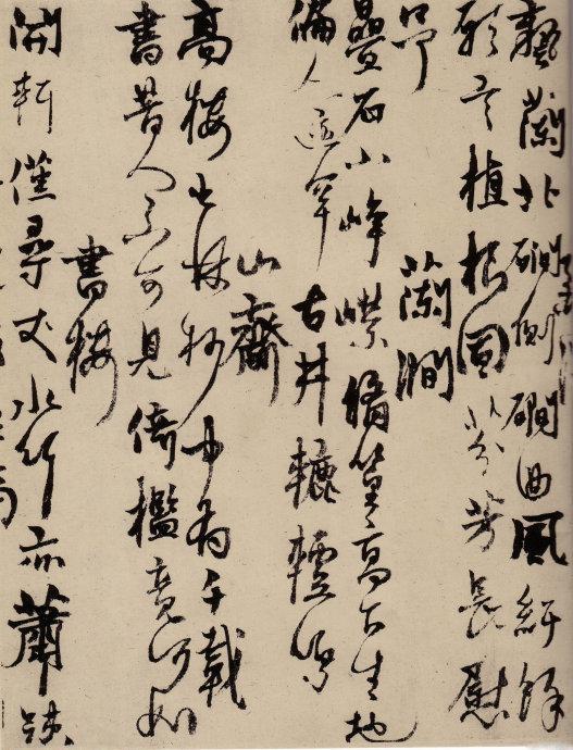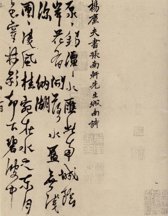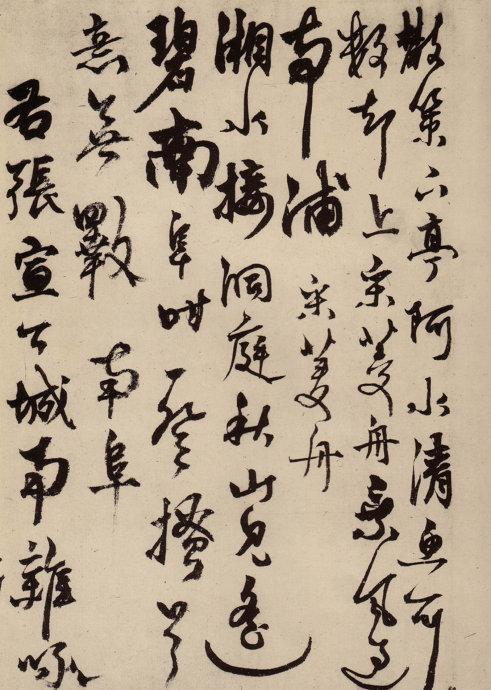 《城南唱和诗》的书写,随意而奇崛,用笔雄劲,笔法跳宕,线条保留了楷书、章草书的清劲、弹性。用墨浓淡互济,干湿对比强烈,飞白随处可见,这是运笔过程中情感律动的痕迹,它们一气下来。竭尽一唱三叹、回肠荡气的能事。线条飞舞,从左到右,从外到内的四处跳跃、纠缠,仿佛舞动的彩绸翻飞而又紧紧围绕挥动的手臂。“穷年竹根底,和我读书声”,诗情触动了书意,一个“声”字,其造型已模糊不复辨,它一笔而成,而几经曲折,最后的竖笔如云崖倾泻的瀑布飞流直下,其气势,豪迈不羁;其意致,浩荡不尽。它是枯与涩的交响曲,又是浓与淡的抒情画卷。形奇、意奇,别有奇趣,娱人心且。杨维桢最后的诗评也写得意态潇洒,特别是写到最后,线条越发奔放、遒劲,结体也越发怪异夸张。“开元诗人不到”的“到”,不但从“不”字开始线条冲突不断,最后一笔也极度夸张,写到最后一字,一个“也”字独占五六字的位置。末笔以豪迈的气势从上往下跌落,并以一个漂亮的圆弧和弯势收笔,酣畅淋漓地表达出作者的心情。值得一提的是,杨维桢好用奇字古字的审美趣味不变。例如“云”字,以篆体的形态出,穷尽线的形态变化,此外如“搔首意无数”的“数”字都用的古体。
