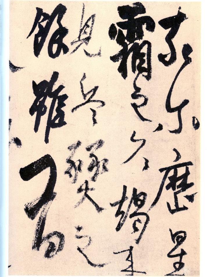 随着跳荡、激烈的笔法而来的,是墨色的争奇斗艳。杨维桢用墨浓重,一如他的下笔猛利干脆。他的字,么一笔总是乌黑照人,粗阔的形态惊人心魄,然后是酣畅地扫下去,一直到墨汁枯尽,由浓至淡,渐至枯涩,犹如一声惊天动地的大叫,然后声音由大渐轻,余间袅袅,由此带来浓淡对比的强烈冲击力。有时一个字中接下去则是枯笔缠绕。所谓老笔纷披,正是指这种恣肆、狂怪的笔法和墨法。再奇妙景象。这完全是杨维桢自我意识的充分流露,怪癖性格的极度张扬。杨维桢作品的粗细、浓淡的对比,悬殊异于常人,像《春消息》中“雷复炼师”,这个“雷”字几乎是一座大山空兀,而“复”的线条若悬丝,两个字形的反差对比是一般人无法想像的,这是真正的骇人心目。