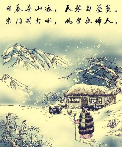 初一看,刘长卿这首五言绝句是一幅“风雪夜归人”的画图。前两句是一组静的景物,日薄西山,苍山隐隐,半山腰闪出茅草的房屋,一片萧疏凄凉的景色。画面中心是诗人拖着疲惫的身子正向茅草屋慢慢移动着,透出断肠人在天涯的况味。而后两句是一组动的画面,天色漆黑,风雪交加,犬吠声打破了山村的寂静,诗人被主人迎入柴门。“归”字用得很妙,有宾至如归之感,日暮途穷,继之以风雪,极尽旅途之苦,风雪中得入柴门,带来了一股温暖的气息。