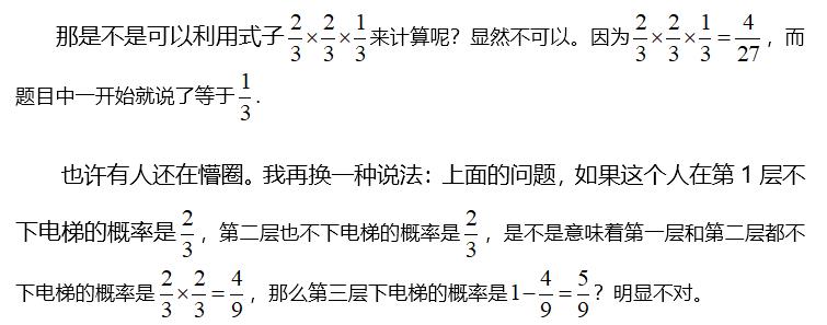 上面的错解实际上是认为这个人在三层电梯中的每一次下电梯是相互独立