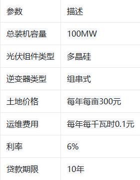 该项目的土地租金为每年每亩300元,共需租赁1000亩土地,因此土地租金费用为30万/年。运维费用为每年每千瓦时0.1元,总计100MW * 8760h/年 * 0.1元/kWh = 876万元/年。融资成本为总投资额的7%,即(8000+45000+5500+4000+2000+5000)* 100MW * 7% = 4556万元。因此该100 MW光伏电站的总造价为10051156万元。
