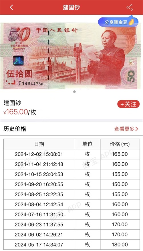 如今,建国50周年纪念钞已成为收藏界的宠儿。其市场价格已远超过面值,单张回收价格大约在150-250元之间,而如果是百连号,其市场交易价格更是高达2万元以上。这一价格不仅反映了建国50周年纪念钞的珍稀程度,更体现了收藏者对其历史价值和艺术价值的认可。