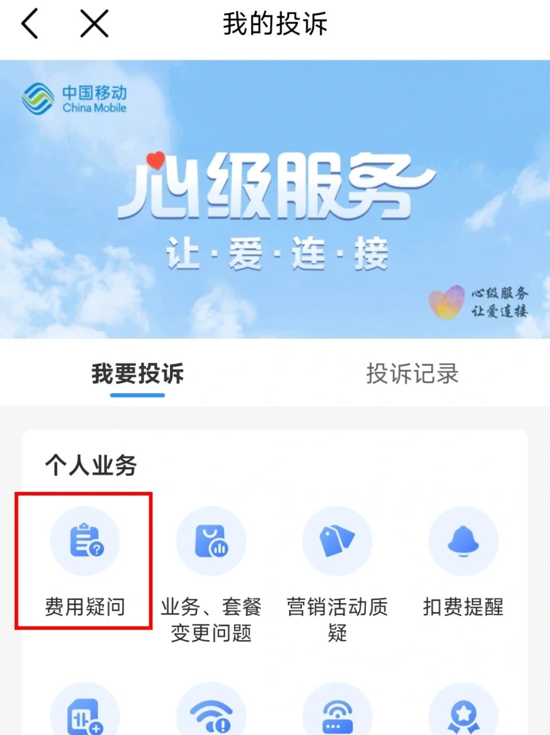 ②在跳转的页面点击【费用疑问】-【上网流量计费质疑】