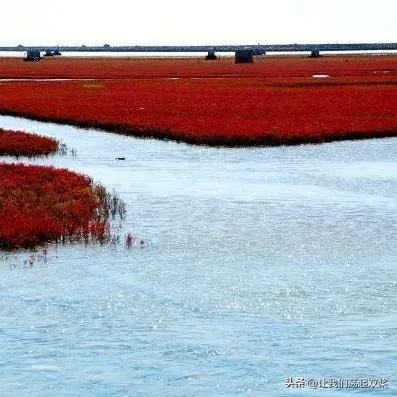 3、红海滩:海滩上生长着红色植物,秋季时一片火红,与金色夕阳交相辉映,美如画卷。