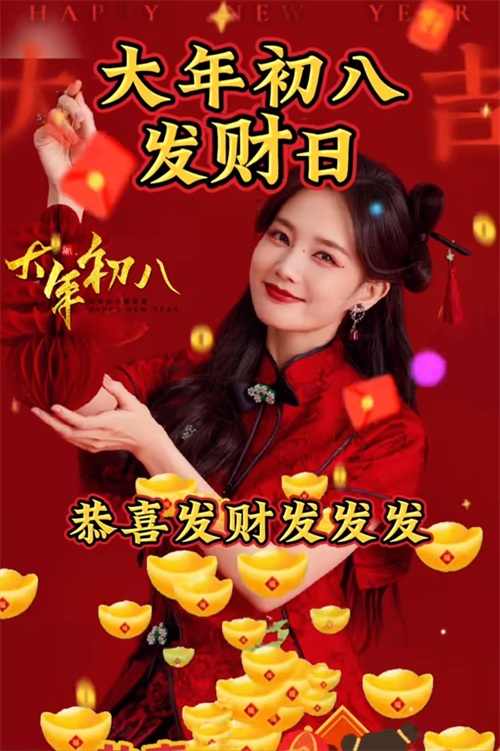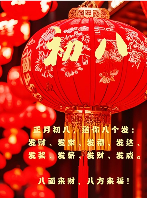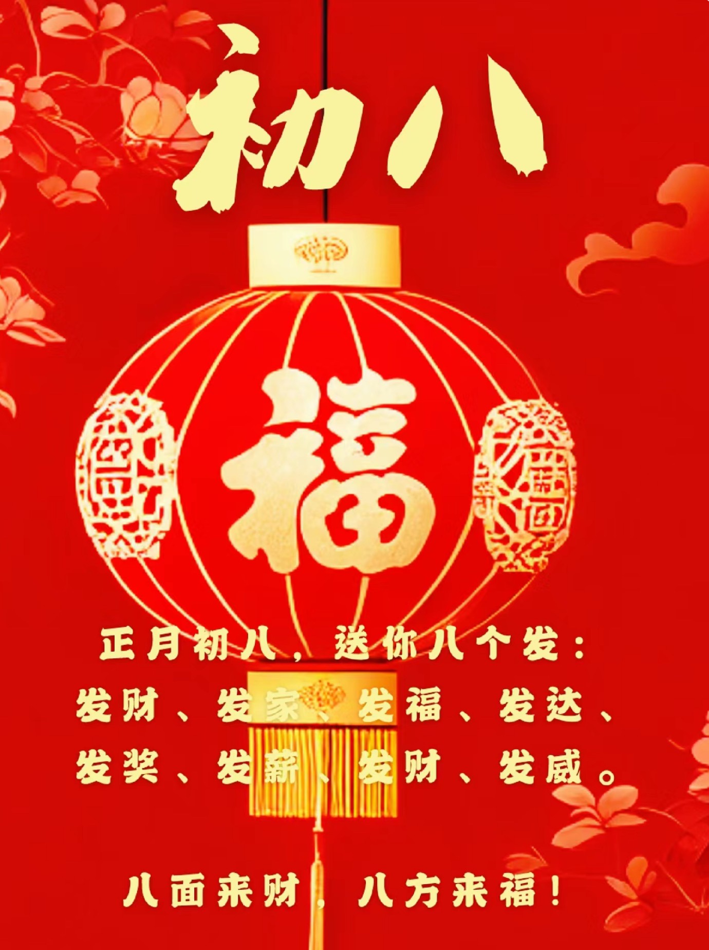正月初八,恭祝您:发财,发家,发福,发达,八方来福,八面威风,八面玲珑,八仙过海!发发发!