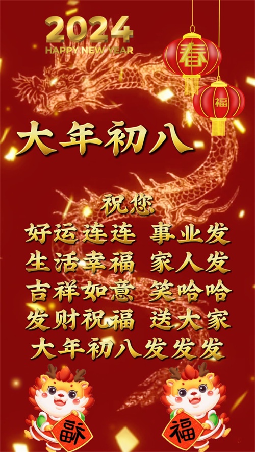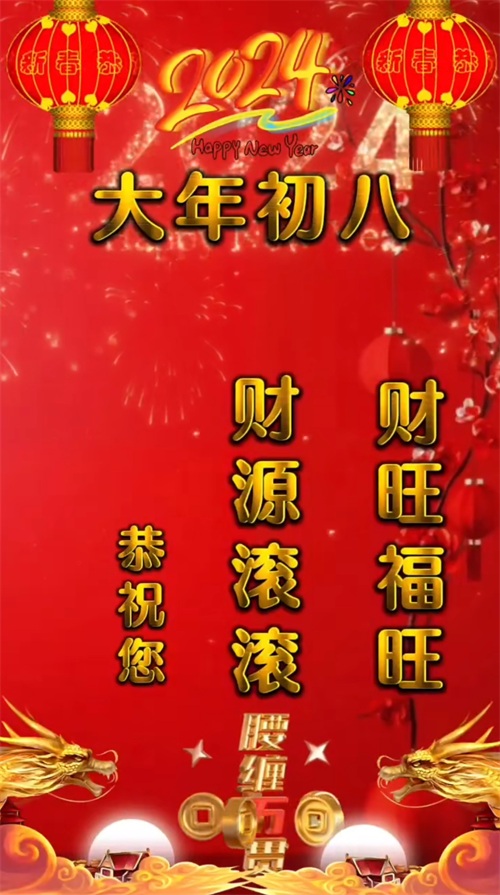 正月初八,八方来财,八方来喜,八方纳福,诸事发发发!恭祝您福星八方照,龙行天下好运招!福龙送吉好运到,富贵荣华福如海!愿国泰民安,风调雨顺!