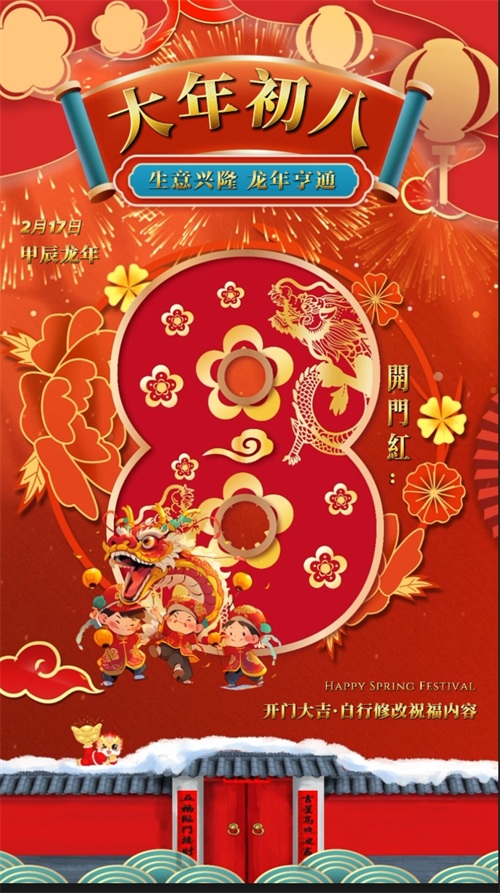 正月初八,开门大吉!红红火火过大年,喜气洋洋开门红!正月初八,诸事皆发!祝大家前途坦途,事业发,紫气东来,财运发!鸿运当头,开门见喜!