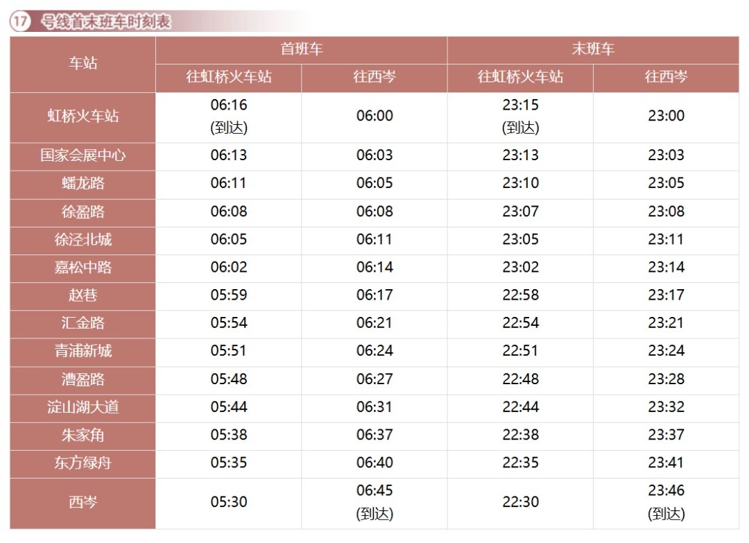 各位小伙伴请注意!随着昨天(11月30日)首班车起,17号线西延伸东方绿舟站(不含)至西岑站开通,上海地铁全网首末班车时刻表也随之更新。请大家收藏~详见↓
