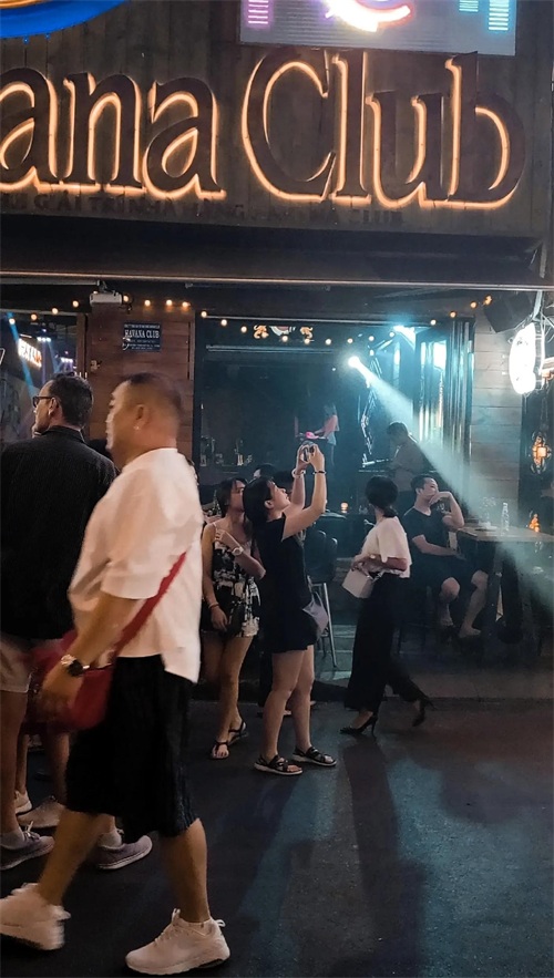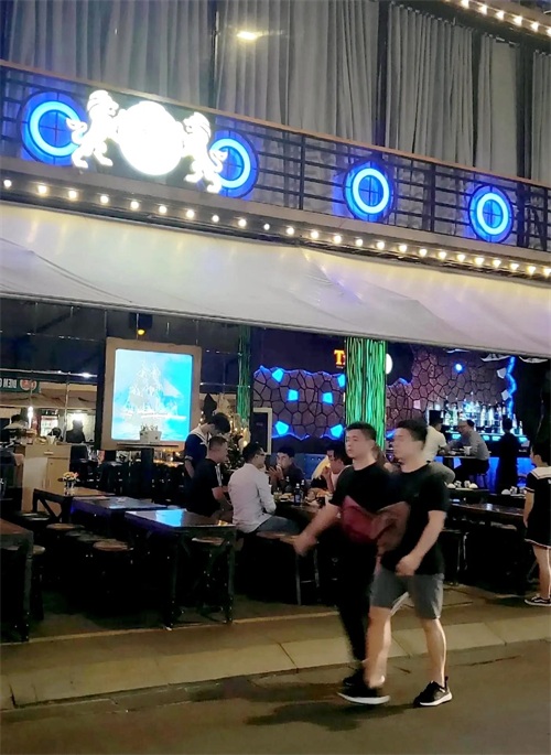 这里白天静悄悄的一到了晚上客人蜂拥而至五彩迷离的灯光,劲爆的音乐,妖艳的美女,糟杂的人声,卖各式东西的小商小贩,酒吧接待的小哥哥小姐姐都在大街上吆喝揽客。