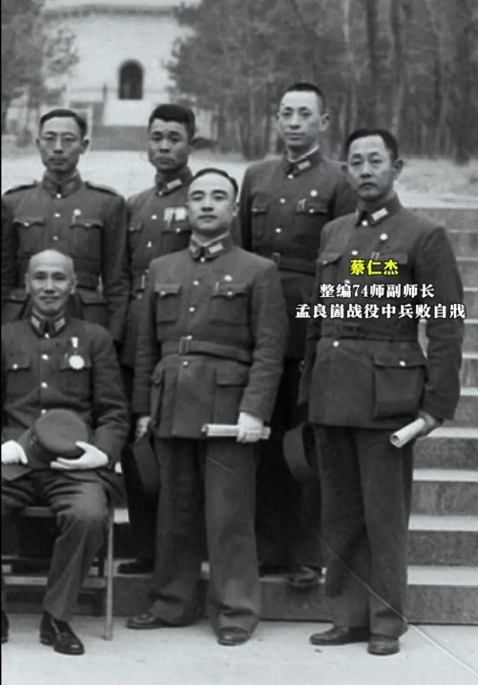 1946年,蔡仁杰和蒋中正的一张合影,镜头中的蔡仁杰一身戎装,穿着皮鞋,他的手里拿着一顶军帽,面对镜头看起来表情非常严肃,这一年的蔡仁杰44岁,就在不久前他被任命为了第七十四军副军长。