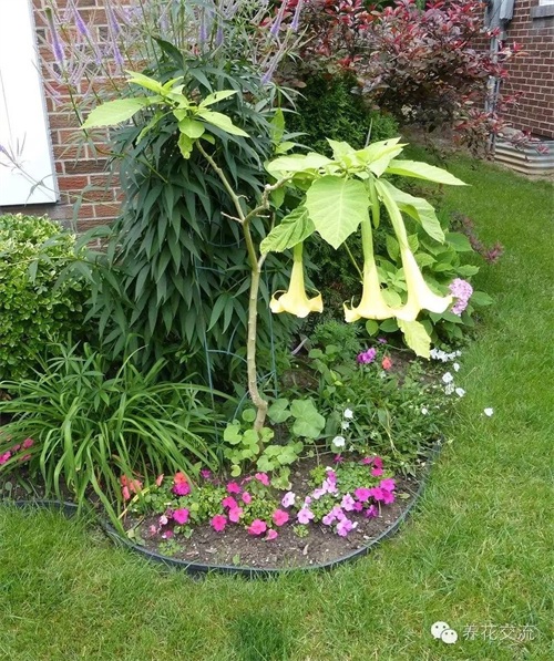 曼陀罗原产南美,花园中常见的是白色、黄色像喇叭花的矮生植物。花朵有香味,到晚上香味更浓。