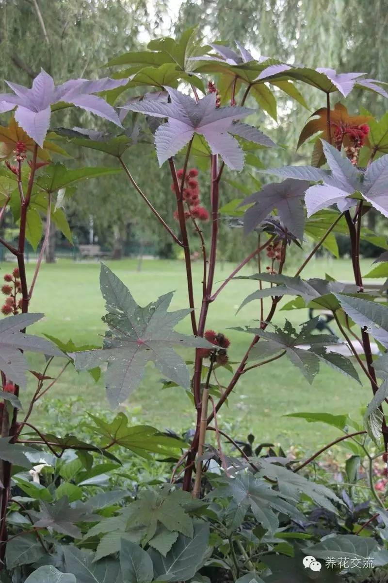 这植物原产非洲东部、地中海一带,也叫它蓖麻子,经常在公园中见到,是一年生植物中可以长到最高最大的,(唯一可以相比的是向日葵)。