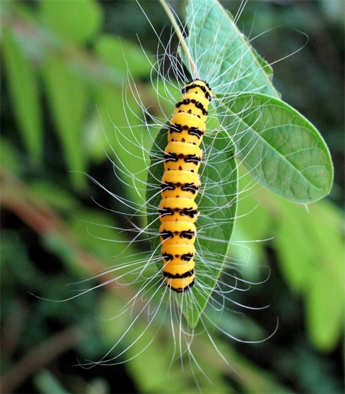 臭椿夜蛾的老熟幼虫,身上的毛茸特别长,身体色彩鲜艳,但不是有毒的虫子