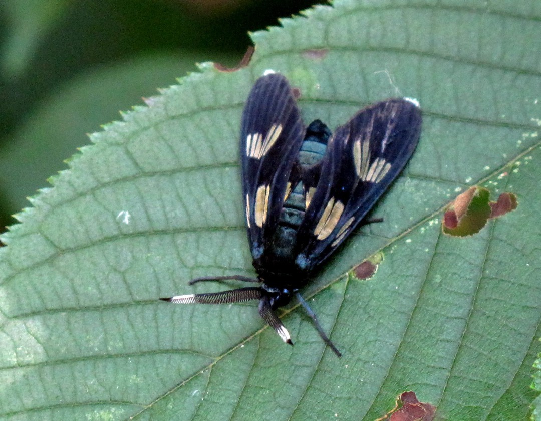 马汀氏竹斑蛾(斑蛾科),触角呈现深蓝色,翅膀通体黑色,外形上与新鹿蛾有点相似,但触角的形态又像鹿蛾的。