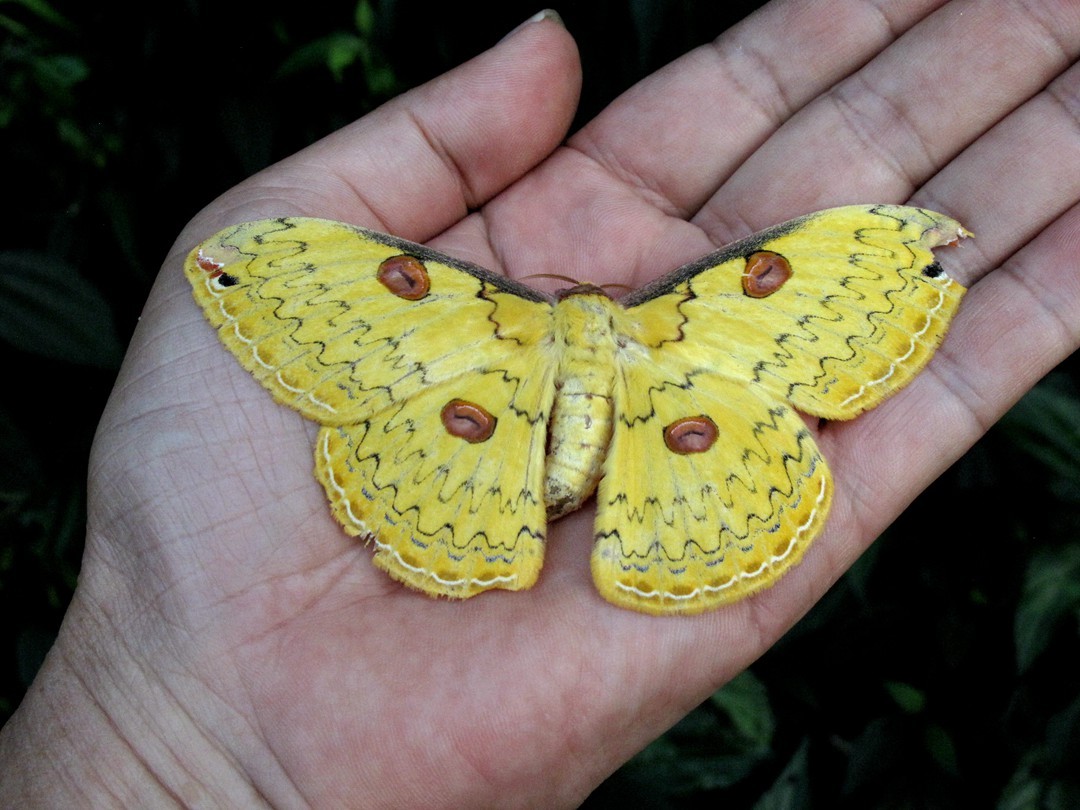 黄豹大蚕蛾,个体硕大,图案华丽精美,每片翅膀上都有一枚醒目的眼斑,属于观赏性的大蛾子,美感决不输于蝴蝶。