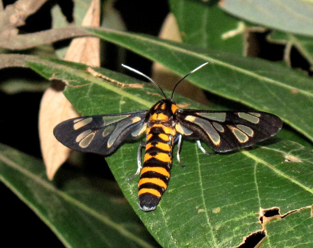 明鹿蛾(鹿蛾科),鹿蛾科是一类模拟蜂类的有毒蛾子,翅膀狭长,并有透明区域,腹部醒目的黄白相间的图案是种典型的警戒色,因此它们的行动往往比较迟钝。