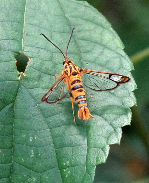后来我又在别处拍摄到樟帕透翅蛾和金蜂透翅蛾。这些透翅蛾科的蛾子比较罕见,是典型的模拟蜂类的蛾子,由于蜂类都是比较凶猛的昆虫,它们不仅有尾部的毒针,头部的大颚也是相当厉害的,因此把自己伪装成蜂类是相当巧妙的生存策略。有一类食蚜蝇,属于苍蝇的近亲,它们的另一个名字叫“拟蜂蝇”,也是采取相同的拟态方法来吓唬天敌的。蝇类与蜂类在形态上原本就差不多,拟态起来只要作细微的调整即可。而蛾子与蜂类的差距着实有点大,但透翅蛾科的种类照样能模仿得惟妙惟肖,那是很不容易的,这无疑是蛾类中的奇葩类群。有意思的是,金蜂透翅蛾是在城区内被发现的,原来我们身边有时就潜藏着某些特别的昆虫种类呢!
