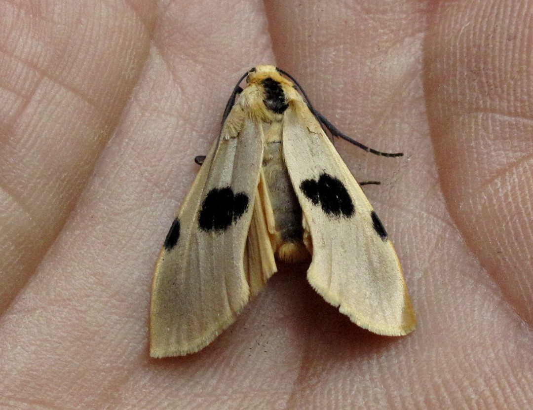四点苔蛾(灯蛾科),苔蛾科的幼虫通常具有长长的体毛,它们会用这些体表的长毛编织成一个茧子在里边化蛹,一种很有创意的茧,有的幼虫以藻类或苔藓为食,属于一类小型蛾子。