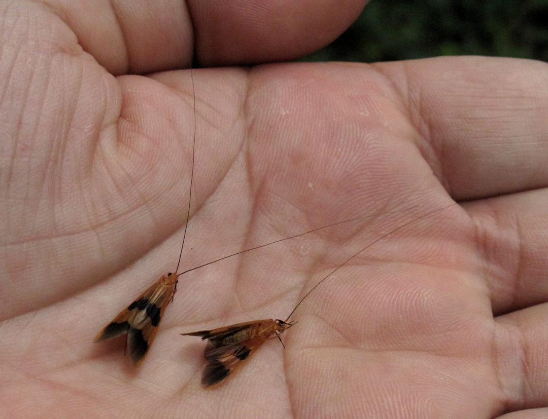 黄纹长角蛾(长角蛾科),长角蛾科是一种原始的小蛾子,以触角极其细长而得名,其雄性触角一般能达到翅长的3倍,其触角非常坚韧,很难折断,飞行姿态很怪异,类似蜉蝣那样的忽上忽下,个体虽小,但其翅膀上具有金属光泽,色彩非常艳丽。