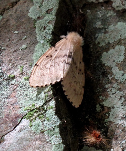 红缘舞毒蛾(毒蛾科),刚刚在岩石上羽化出来,幼虫的皮壳落在下方不远处,幼虫都是有毒毛的主儿