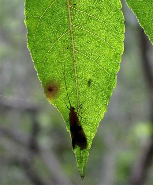 横带长角纹石蛾(长角石蛾科),触角明显长于身体,属于毛翅目的一种小蛾子,将叶片慢慢地翻转过来,才能看清其真实的形态特征。