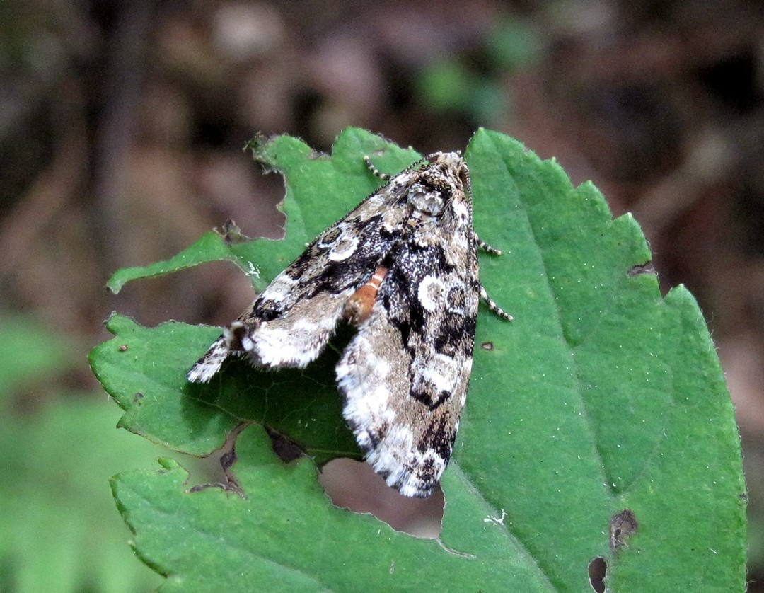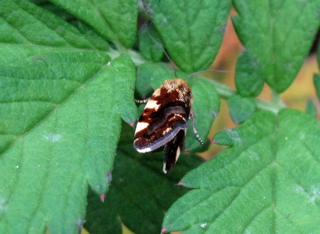 金盏拱肩网蛾腹面(网蛾科),个体较小,但图案还是相当精致的,网蛾科的幼虫会集体吐丝结成很大的网幕,它们躲在网幕内生活,以此来防御天敌,这种生存策略很有效,有点抱团取暖的味道。