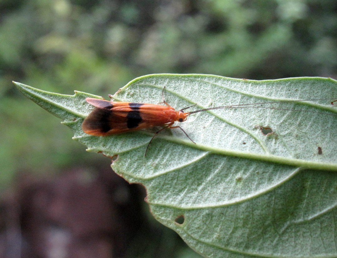 横带长角纹石蛾(长角石蛾科),其触角出奇的长,很容易让人误以为也是种长角蛾,但其翅膀上没有鳞片,只有不明显的毛茸,显然是种毛翅目的石蛾种类。