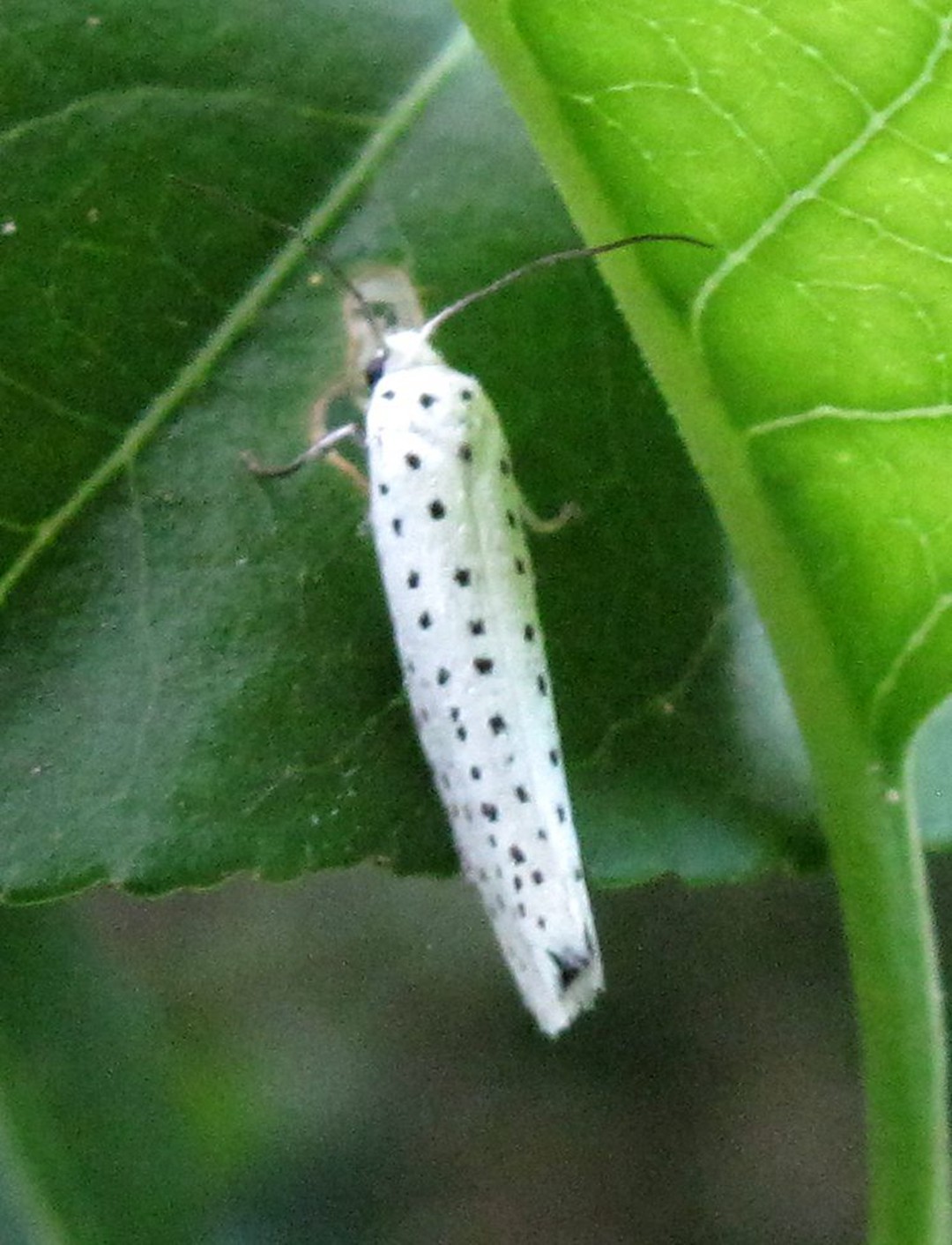 稠李巢蛾(巢蛾科),巢蛾科与网蛾科的幼虫一样,会集体吐丝结成很大的网幕,它们躲在网幕内生活,以此共同来防御天敌。
