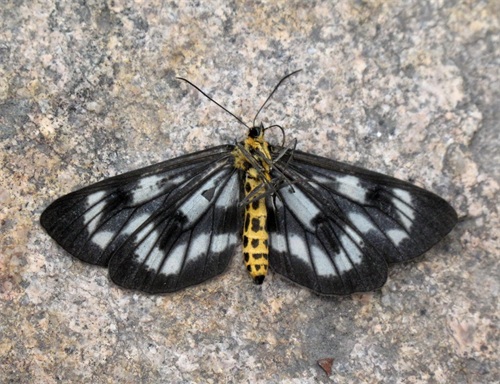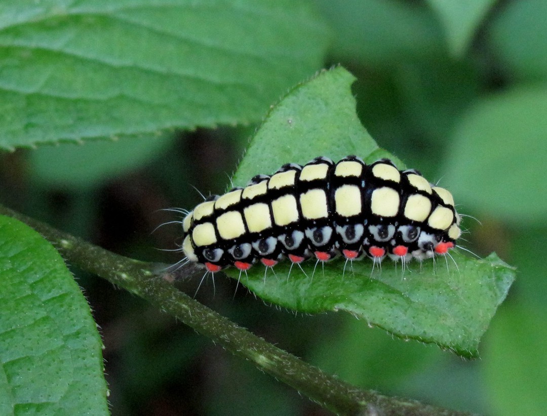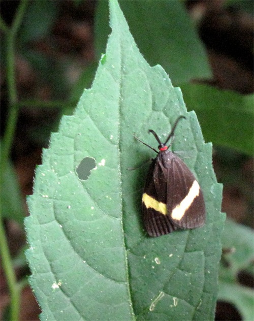 萱草带锦斑蛾(斑蛾科),它们白天会在林间活动,一种小型的斑蛾,黑色翅膀上有醒目的黄色条带,加上红色的头部,也是种警戒色。