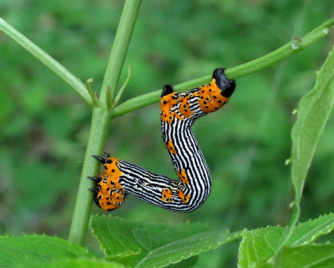葫芦夜蛾的幼虫(夜蛾科),专门啃食葫芦科瓜类植物的叶片,幼虫头部细尖,尾部粗大,食量大,生长迅速,对植物的危害性大。
